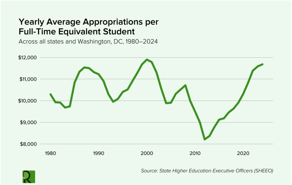 Contrary to what we often think (and what I once thought), the new politics of the neoliberal era did not lead to an overall decline in per-student funding for public colleges. In fact, even in inflation-adjusted terms, per-student funding in 2024 was actually higher than per-student funding in 1980. But funding did become much more volatile and came with more strings attached. With less budgetary flexibility (the result of prohibitions on raising taxes without supermajorities, balanced budget amendments, and the like), state governments began to use cuts to public colleges as a way to deal with shortfalls during downturns, restoring funding only once budgets were safely balanced again. And state governments began to make more funding contingent on colleges’ meeting various metrics of “performance” and/or to provide more funding through student grants rather than direct payment of operating expenses.